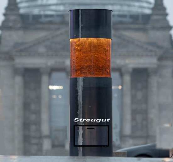 Rechtzeitig zum Wintereinbruch wurde vor dem Reichstag in Berlin ein künstlerisch gestalteter Behälter mit Streugut aufgestellt. Bürger können bei Glatteis jetzt selber mit der Asche von Toten dafür sorgen, dass Politiker nicht ins straucheln kommen.